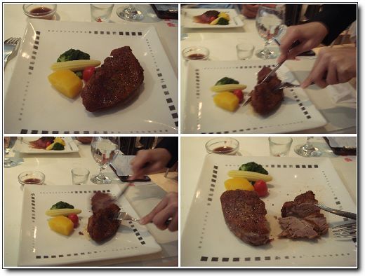 沙瓦,喝起來酸酸甜甜(可續杯) 服務人員送上了沙瓦後,開始了我們的主餐主餐部份我們選了牛排、鴨胸和南極冰魚想選雞肉吃看看,但又覺得來到這裡吃雞肉似乎太廉價了而王品的每家餐廳鴨胸都不錯吃所以想想還是點了法式鴨胸吃每個主餐送來,服務人員都會解說一番而我和姐姐點的法式鴨胸和南極冰魚,也有一邊幫我們切開和解說不吃牛的我,不曉得牛排口味如何.. 而鴨胸我覺得還可以,就很一般冰魚很新鮮的菜色,但不曉得為什麼魚肉吃起來卻不嫩,有點硬硬的.. 這是繼上次許多年前吃西堤的烤羊膝之後我覺得主餐不甚好吃的一次..