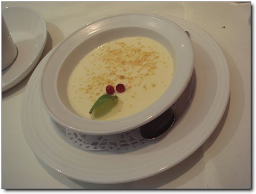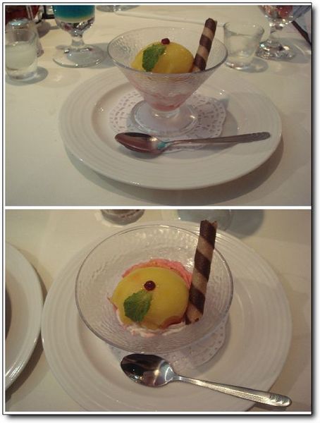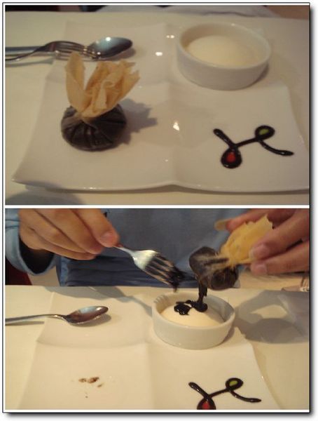 甜點-巧克力袋冰淇淋 甜點方面,我真的掙扎於烤布蕾和百香雙色慕斯之間因為我覺得烤布蕾沒有奶酪好吃而我又不喜歡酸的東西,慕斯又過於甜..真的好難選擇..=.= 而且網站上看的新的甜點竟然沒有.. 最後因為姐姐點了烤布蕾,所以就點了個不一樣的來看看於是我點了百香雙色慕斯結果,沒有想像中的難吃,除了慕斯不夠軟之外百香冰沙和著鮮奶油卻很好吃... 而烤布蕾就是一般,但也蠻好吃的巧克力袋冰淇淋還是很令人新奇..連姐姐都問說那要怎麼吃..呵呵'