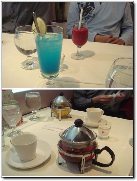 飲料-雪沁藍橙 / 桑椹冰沙 / 熱水果茶 / 玫瑰森林 飲料部份.. 雪泌藍橙的顏色很搶眼,漂亮不過喝起來就是很淡的雪碧=.= 或許桑椹冰沙還比較好喝熱水果茶是我原本想點的飲料,但喝起來也還好玫瑰森林有一股香氣,喝起來倒卻像花果茶 這樣一套餐下來,真的好飽.. 不過在西堤我們看到了一個有點可怕的事因為我們用餐完已經快4點了距離晚餐開始時間好像只剩1小時西堤的服務人員很快的就把餐桌都佈置好此時,友人示意我們看一下隔壁的桌子就在大家不解時... 他說道..王品的水好像不要喝比較好聽了依然是一愣.. 他又說..5點才用餐,現在每桌的杯子就把水倒好那他不會想11點半用餐時間來的不一定服務人員們在早上10點就把水倒好了.. 大家聽了只是一笑...(很監介的一笑) 心想..還好我們1點多才來:p 不過,我想注意品質和服務的王品應該是喝了沒關係的吧(只好這麼安慰自己^^") 【店名】Tasty.西堤【店址】台北縣板橋各分店請進http://www.tasty.com.tw/