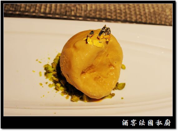 金箔松露手工焦糖冰淇淋外觀看起來像一顆蛋型的樣子,不過主廚卻給了一個缺口拗平的特殊造型