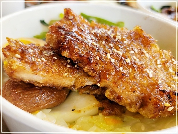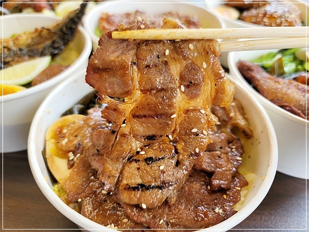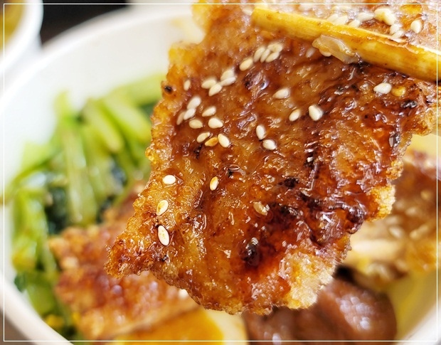 嚴選溫體里肌肉的烤排骨飯,店家說先將里肌肉經過拍打斷筋(吃起來不會因為有筋難咬難嚼食) 整個肉片鬆軟後再醃製自己研發的醃料,會先炸再烤再刷上獨特醬汁