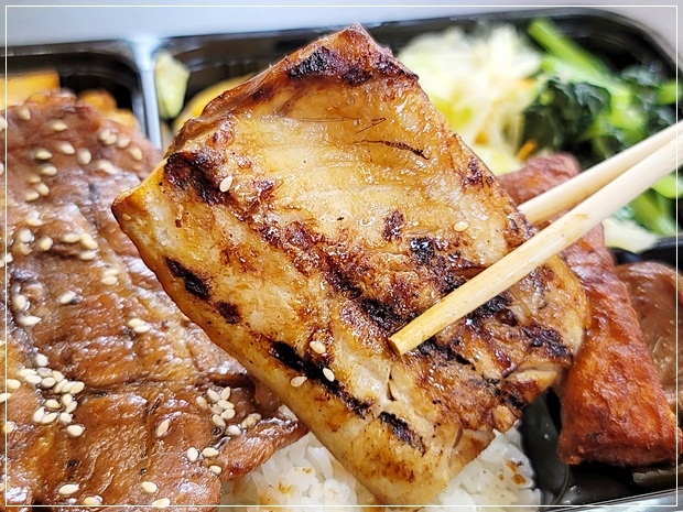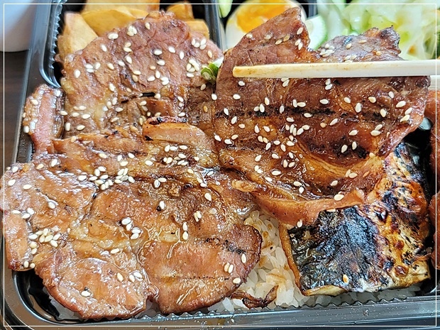 鯖魚表面烤得酥脆,再灑上椒塩粉,附上檸檬片,已超出便當盒的烤鯖魚最推薦給愛吃魚的捧油們了