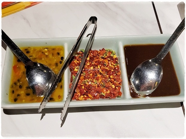 在片鸭醬料上...基本的甜麵醬、辣椒粉,還第一次看到有百香果醬