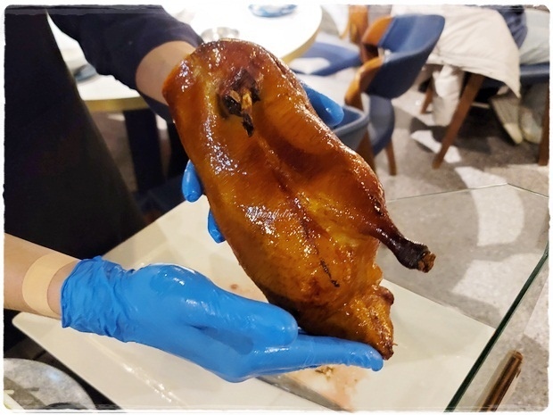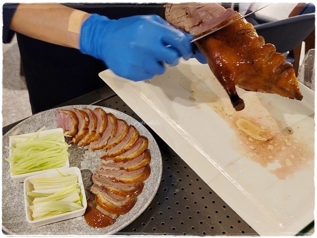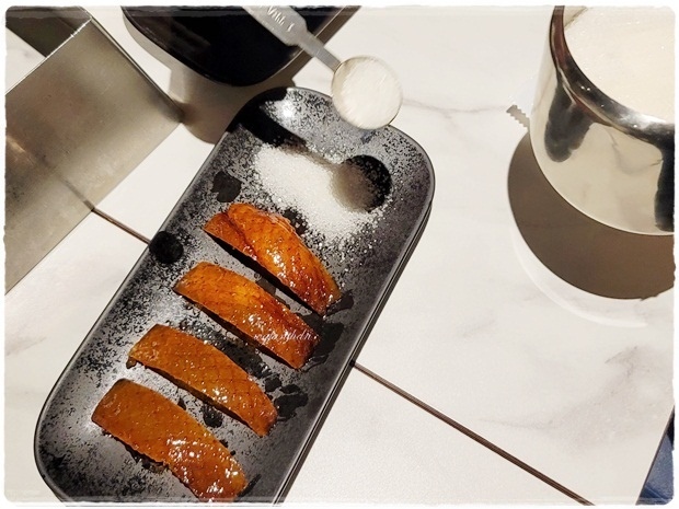 很特別的是片鴨師傅會先片4片鴨皮,服務人員灑上白糖